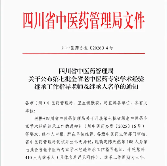 近日,四川省中医药管理局正式公布第七批全省老中医药专家学术经验继承工作指导老师及继承人名单,宜宾市中西医结合医院3名主任中医师入选第七批全省老中医药专家学术经验继承工作指导老师、6名中医师入选继承人。彰显了我院在中医药学术传承、人才培养领域的深厚实力与突出成效。