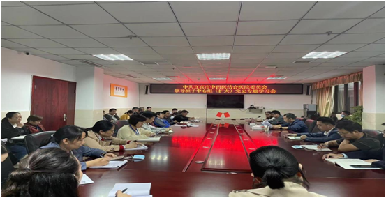 2021年10月14日下午15:00,在宜宾市中西医结合医院十楼会议室,党委召开领导班子中心组专题学习会,党政领导班子、中层干部参与会议。